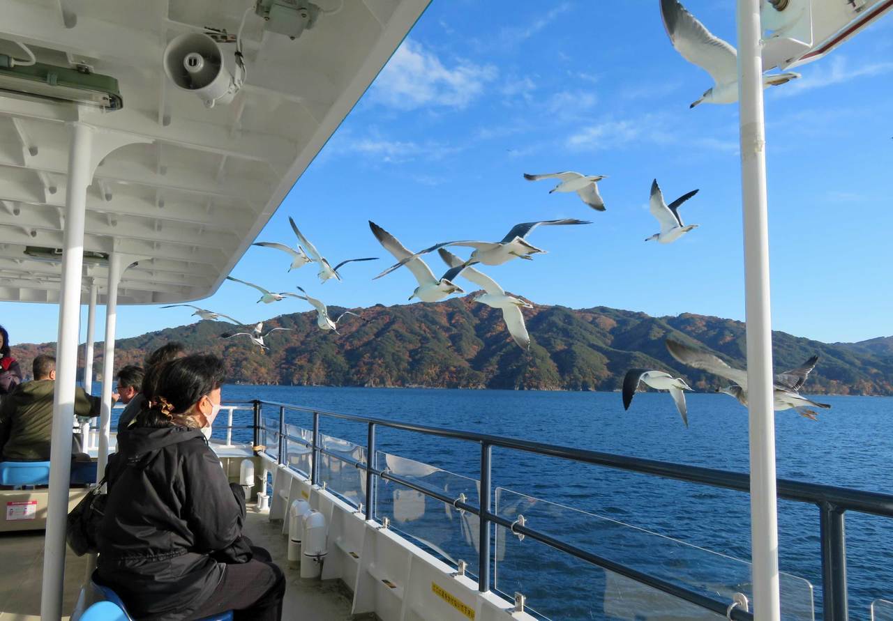 国の指定名勝「浄土ヶ浜」をはじめ、国指定天然記念物「ローソク岩」や数々の奇岩について、ガイドの方の解説を受けながら三陸海岸クルージングを楽しんだ。また、クルージング中にウミネコへの餌付け体験も行ったのだが、間近に見るウミネコは想像以上に大きく人間慣れしており、超至近距離で行う餌付けは非常にスリリングで、船上のあちらこちらで悲鳴にも似た声が上がるなどとても賑やかであった。